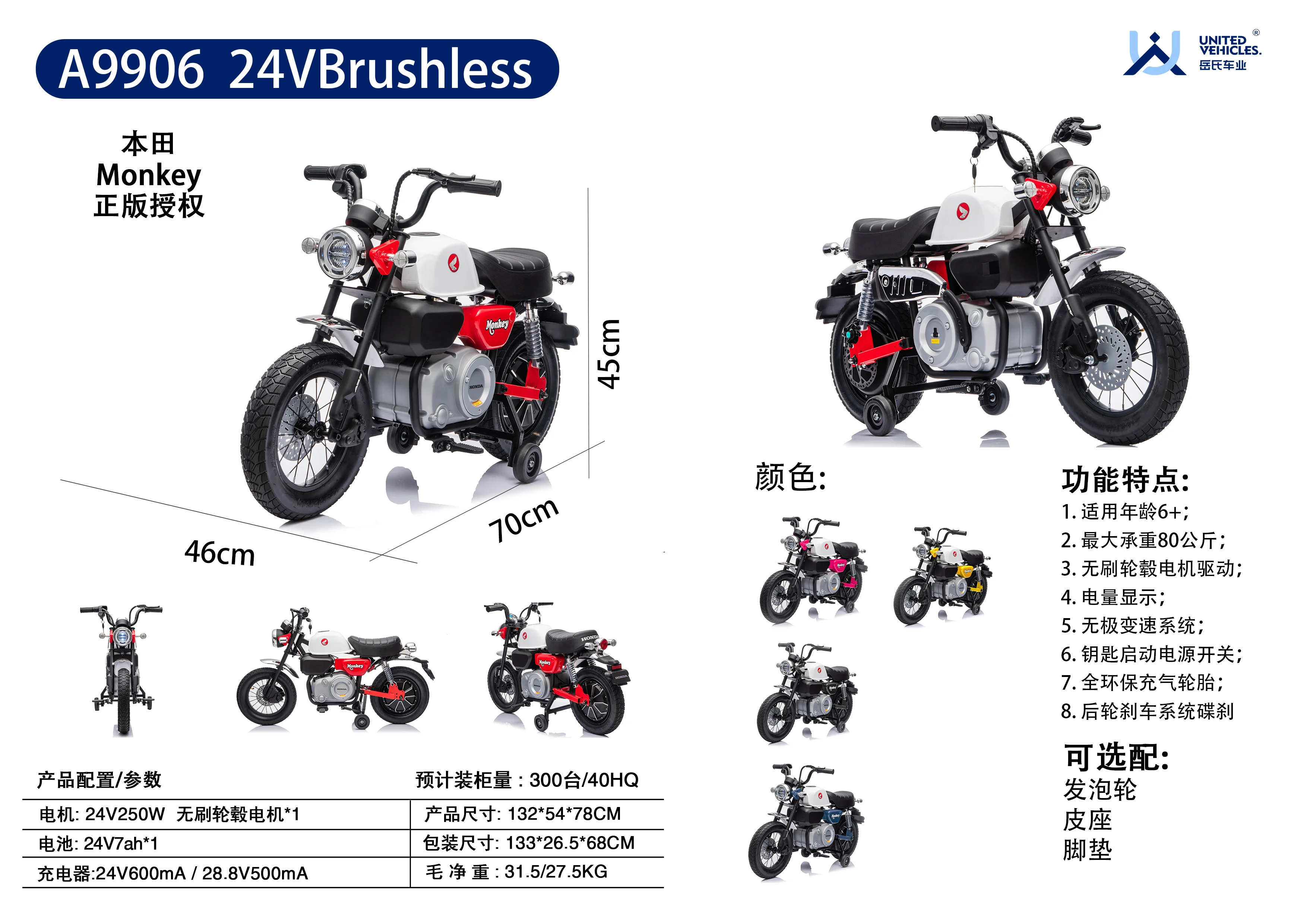 產品尺寸:132*54*78CM 產品包裝尺寸:133*26.5*68 產品毛凈重:31.5/27.5KG 1. 適用年齡6+ 2. 最大承重80公斤; 3. 無刷輪轂電機驅動; 4. 電量顯示; 5. 無極變速系統; 6. 鑰匙啟動電源開關; 7. 全環保充氣輪胎; 8. 后輪剎車系統碟剎 ">
